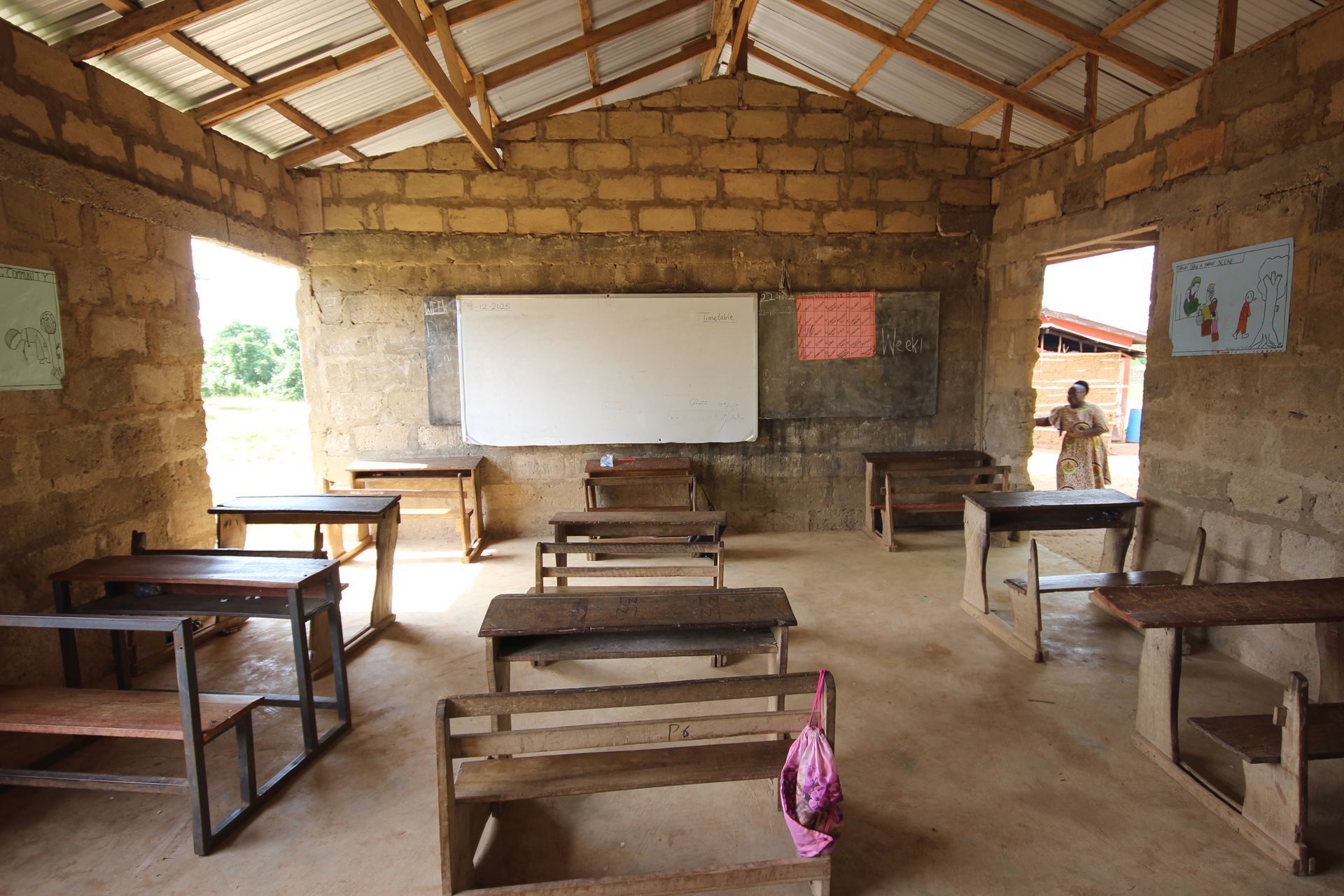 Some of the schools Village by Village has built are well-established now, bright, painted, equipped with water tanks and proper facilities. Others are newer, more basic. One open-air classroom I visited was a simple structure of bare breeze blocks and a corrugated iron roof.